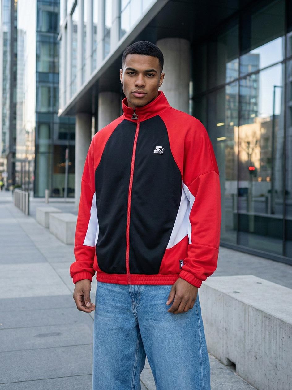 Męska kurtka treningowa w stylu streetwear przyciąga uwagę wyrazistym krojem i kontrastowym blokowaniem kolorów. Luźny fason z szerokimi, opadającymi ramionami, stójką oraz elastycznymi mankietami i dołem zapewnia komfort i swobodę ruchów. Model posiada boczne kieszenie oraz zamek z charakterystycznym uchwytem Starter. Kolorowe wstawki i dopracowany branding – gumowa naszywka na piersi, haft na rękawie oraz tkane logo na kieszeni – podkreślają sportowy charakter kurtki. Całość uzupełnia przeszycie Starter na karku.