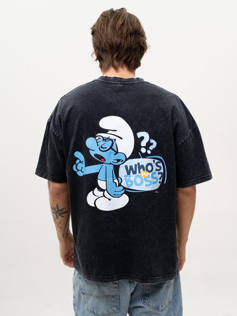 T-Shirt Oversize Męski Czarny Acid Wash Smerfy Ważniak Boss